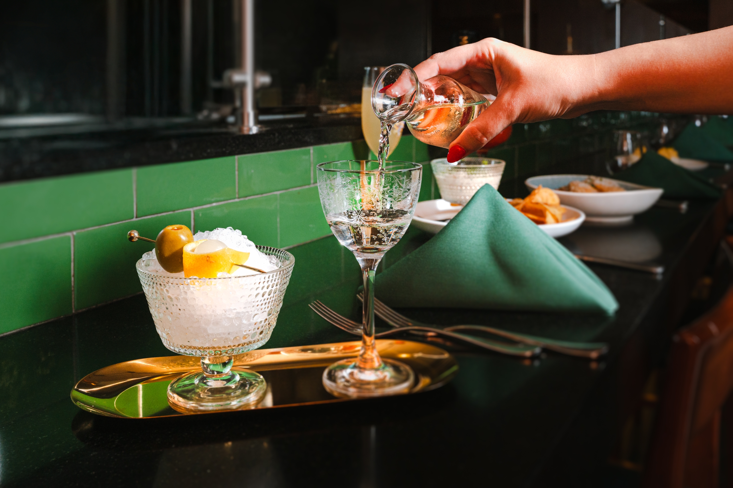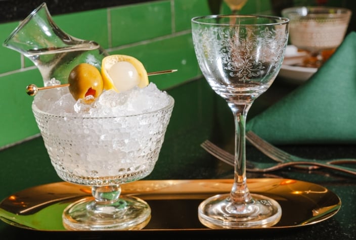 First thing to discuss is the topline goal, making something that is a truly marketable experience. One form that has been on the rise is adding a tableside element to the bar program. This creates engagement with the guest and can add revenue to the beverage topline. For example, serving a martini at $17 or offering a martini service with garnish choice, and a presentation like the one in the picture for $21. It reflects the same ingredients, but the perceived value and showmanship makes it more.